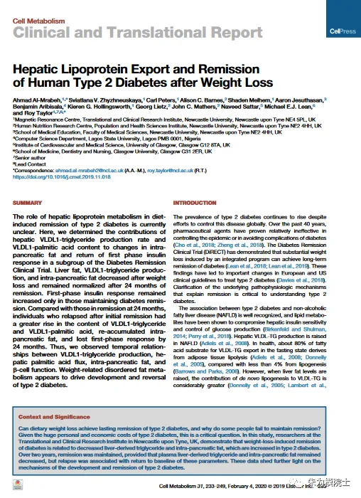 不过有一个好消息,由英国纽卡斯大学罗伊·泰勒(Roy Taylor)教授团队在细胞代谢《Cell Metabolism》杂志上所发表的一项研究(Al-Mrabeh et al., 31,1-17, 2020; )揭示了脂肪、胰岛素阻抗和糖尿病之间的关系,并证明大多数的糖尿病患者是可以通过减肥逆转的!https://doi.org/10.1016/j.cmet.2019.11.018