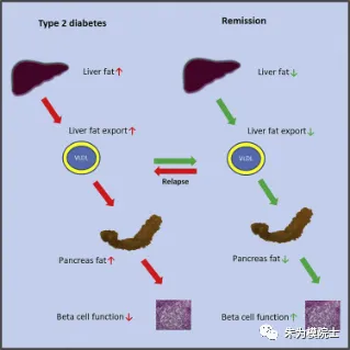 1. 脂肪过多是较长时间的能量进多出少(吃的太多,运动太少)所致。2. 人的脂肪一开始是存在于皮下,过多后开始向全身包括肝脏和胰腺转移。3. 当肝脏和胰腺脂肪高到一定程度以后(人与人之间在脂肪忍受度上有不小的个体差异),胰腺受阻,关闭了指导如何有效产生胰岛素的基因,Beta细胞功能下降,从而导致先是出现胰岛素阻抗,然后变成II型糖尿病。脂肪导致糖尿病和可能逆转示意图