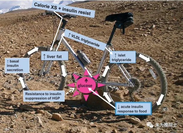 4. 可喜的是,II型糖尿病可以通过减少能量的摄入(每天825-853千卡)而带来的肝脏和胰腺里的脂肪减少来逆转!5. 更有甚者,逆转后大多数人(90%)可以保持2年以上。其中一小部分人在干预中VLDL1-TG(VLDL1-甘油三酸酯,一种对心血管有害的低密度胆固醇)的变化较小,他们的脂肪反弹可能性较高。脂肪反弹后,II型糖尿病也会重新出现。这些发现也是对泰勒教授在2008年提出的双循环假设(也即肝脏和胰腺脂肪增多,人会得II型糖尿病;相反,肝脏和胰腺脂肪减少到一定程度,糖尿病可以逆转)的支持。我很欣赏泰勒教授用自行车的两个轮子来解释他“双循环假设”。