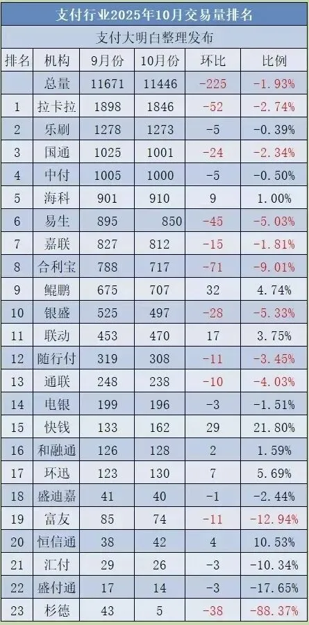 近日,支付行业 2025 年 10 月份交易量排名正式公布,行业整体总交易量为 1.14 万亿,这一数值处于相对低位,行业增长动力不足的态势凸显。