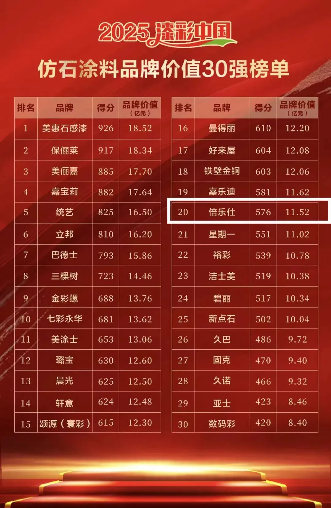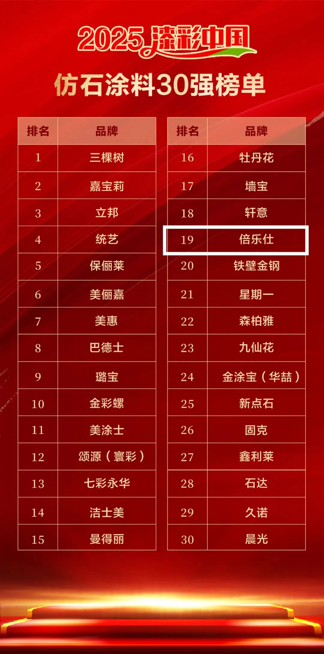 2025年11月1日,涂料行业权威媒体“看涂说话”重磅发布《2025漆彩中国仿石涂料品牌价值榜单》。在这份备受行业瞩目的榜单中,倍乐仕仿石漆凭借扎实的产品实力与深厚的市场影响力,成功荣登“2025漆彩中国仿石涂料30强榜单”和“2025漆彩中国仿石涂料品牌价值30强榜单”双项殊荣,品牌硬实力再获行业高度肯定。