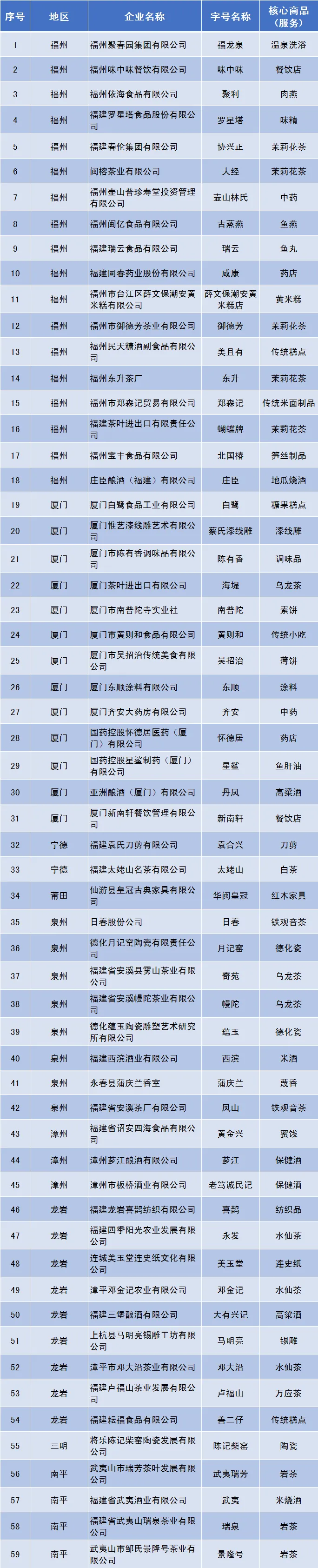 为进一步推进福建省老字号保护和发展,根据《“福建老字号”认定管理办法》,福建省商务厅在全省组织开展第六批“福建老字号”认定工作。经企业申报、各地商务主管部门推荐、专家评审、对外公示等程序,于近日正式公布59个企业的字号为第六批“福建老字号”,具体名单如下: