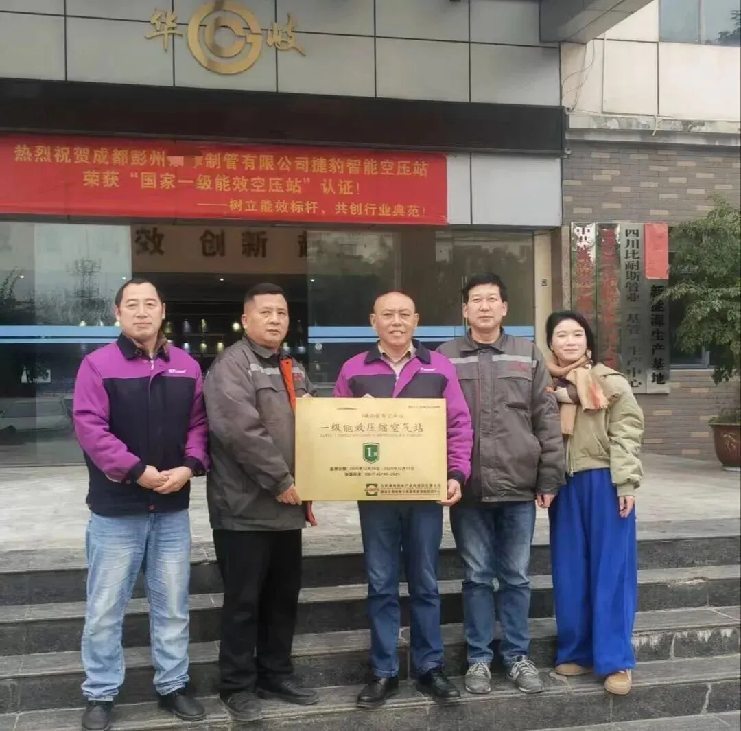 2026 年 2 月,捷豹空压机再传佳绩 —— 携手中国钢铁 500 强企业、日钢管业集团下属成都某制管有限公司,为其量身打造的智能空压站顺利通过权威认证,经合肥通用机电产品检测院依据国家标准 GB/T 45785-2025 现场严苛检验,该空压站综合输功效率达 64.9%,远超行业标准,成功斩获国家一级能效空压站认证,这一成果也再度印证了捷豹空压机在节能技术领域的行业领军地位。