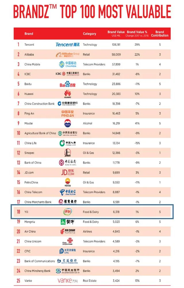 (BrandZ™ 2017年最具价值中国品牌100强,伊利居食品饮料类第一)
