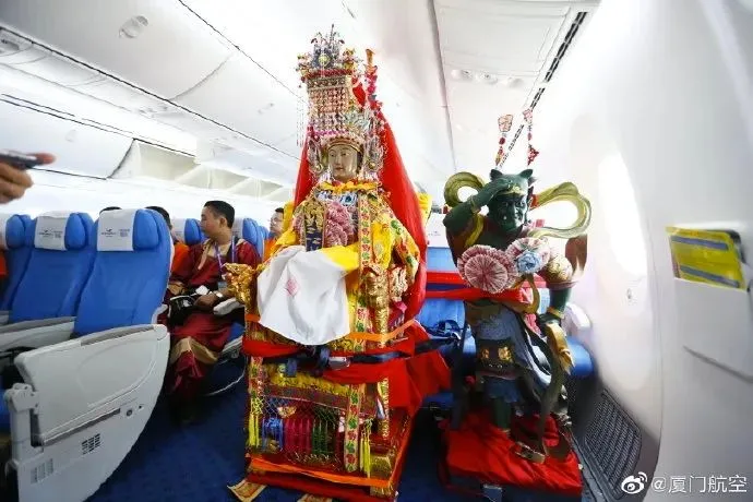 早在2017年7月1日,湄洲妈祖就搭乘厦门航空,飞往马来西亚吉隆坡进行神事交流活动。当时,千里眼、顺风耳作为护法随行,神像们不仅登机,还拥有属于自己的登机牌。