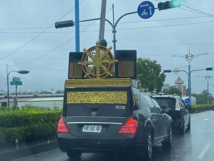 黑色宾士,尾箱改装,挂个法轮,挂牌佛祖车,德国汽车工业在台湾和印度来的宗教信仰擦出了异域的火花,不仅交警看了犯迷糊,对岸的我们看了也迷糊。