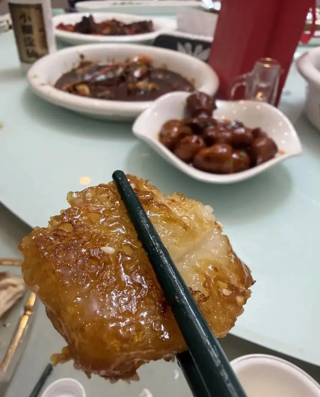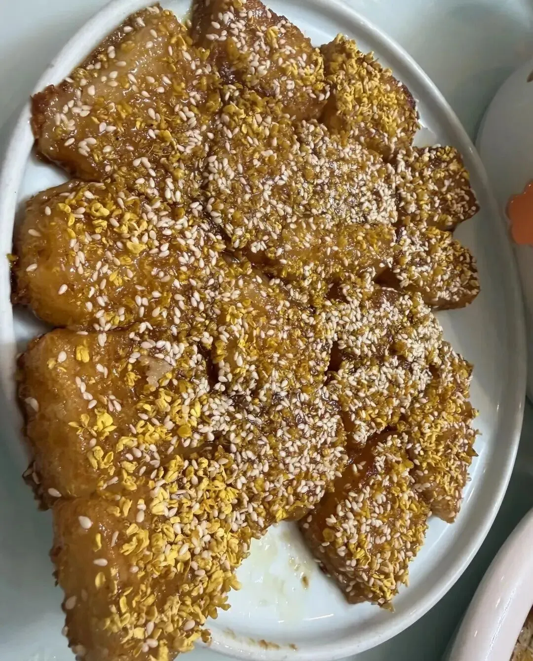 到了之后点了桂花糖年糕 , 端上来的时候第一眼就觉得 , 卖相确实不错 , 外面那层皮煎得金黄金黄的 , 闻着就是那种焦香混着桂花的甜味 , 还没吃心情就已经很好了。
