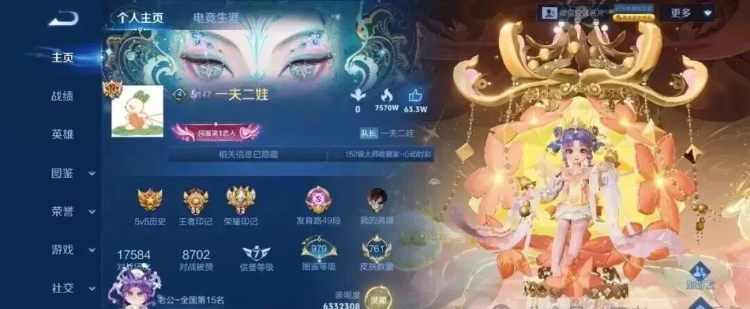 而在这次的吉星排行榜中,全国第一的神豪玩家已然诞生,不管是哪个大区的召唤师,点开榜单都能清晰看到他的身影哦。没错,这位稳坐全国榜首的神豪,ID正是“一夫二娃”。点进他的游戏主页就能发现,去年春节的福星排行榜中,他也稳稳跻身前1000名,妥妥的常年氪金大佬无疑哈。不仅如此,该玩家目前已拥有761款皮肤,虽说如今王者荣耀全皮肤数量已接近780款,他还没集齐全皮肤,但架不住人家财力雄厚、有马内啊。除此之外,去年灵宝相关榜单中,这位玩家也曾拿下全国第15名的好成绩,足以看出他的财力有多不俗,哈哈。不过话说回来,这位玩家主页的761款皮肤其实不算什么,因为更厉害、更惊人的还在后面等着大家呢!