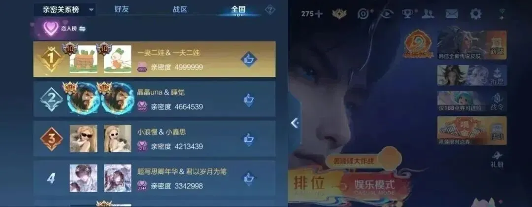 如果要衡量王者荣耀玩家的氪金程度,从贵族积分榜里,其实就能看出几分端倪。除此之外,除了皮肤数量和荣耀战力,王者荣耀还有一个榜单,格外考验玩家的实力与投入。没错,它就是亲密度关系榜单。要知道,当初这个榜单刚上架时,众多情侣玩家就纷纷发力,争相抢夺榜单前十的位置。最终,还是有一对情侣玩家脱颖而出,直接将亲密度拉到4999级封顶,让无数玩家都羡慕不已。之所以说之前看到的761款皮肤不算啥,只因这个专属称号才是重头戏,价值足足百万。是的,就是这个“国服第1恋人”的称号,单单4999级的亲密度,估计就花费了百万马内。