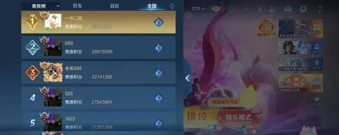 每年推出的氪金活动其实不在少数,而这次的吉星排行榜,主要就是衡量玩家马年春节期间氪金程度的核心活动。没错,吉星排行榜的积分获取有明确规则,除了880积分可通过对局解锁外,其余均需消耗点券获取。1:1的点券兑换积分比例,玩家们一看便能清楚自己春节期间的氪金数额。目前,王者荣耀吉星排行榜活动已正式落幕,跻身全国前1000名的玩家,都能解锁专属头像框、排名称号以及动态签名奖励。另外,排行榜前几名的玩家,积分均已超过100万,也就是说他们这次氪金足足超了10万马内,着实离谱到让人惊叹。