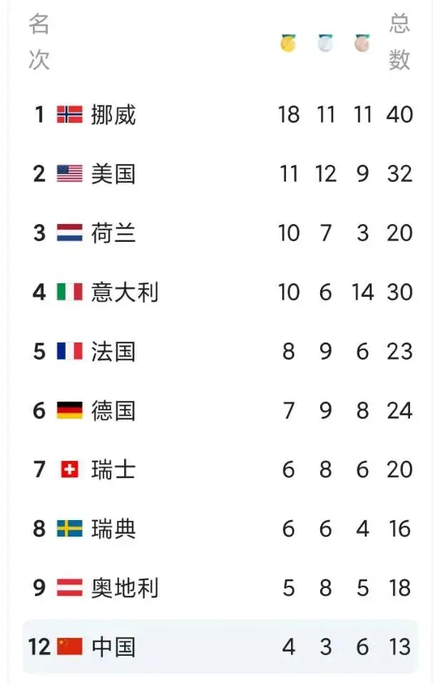 米兰-科尔蒂纳冬奥会2月21日奖牌榜排名