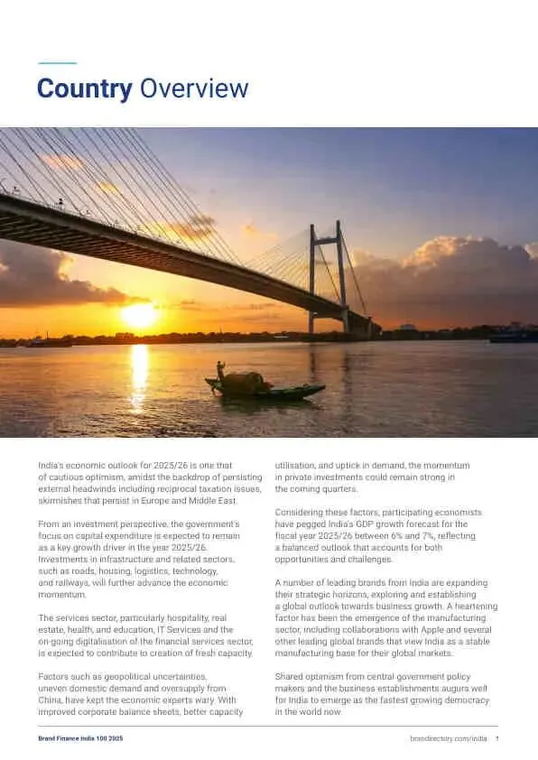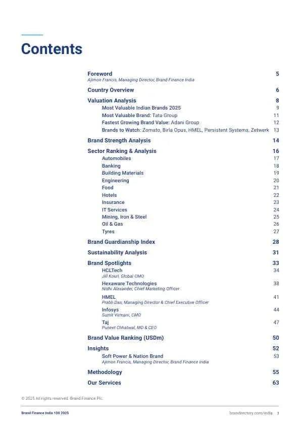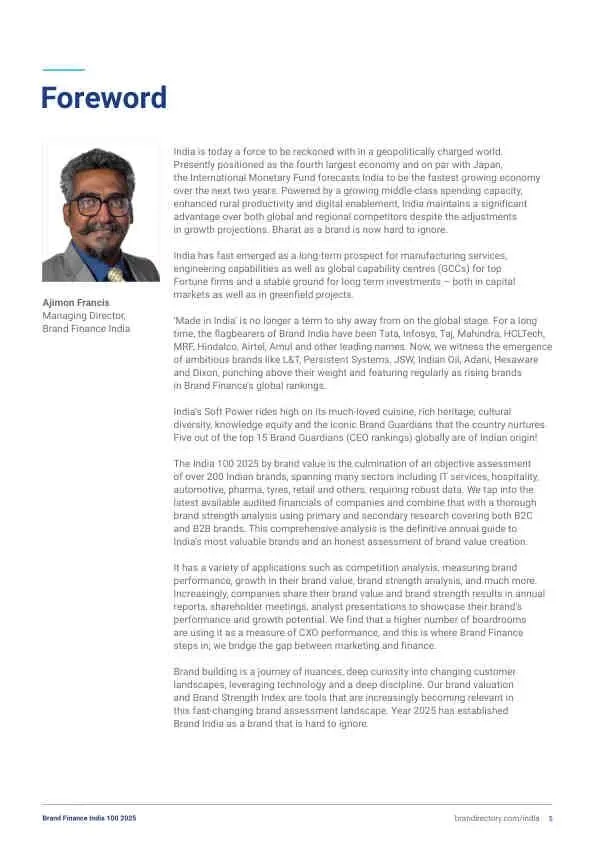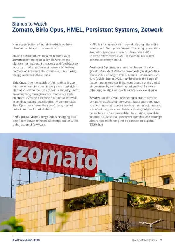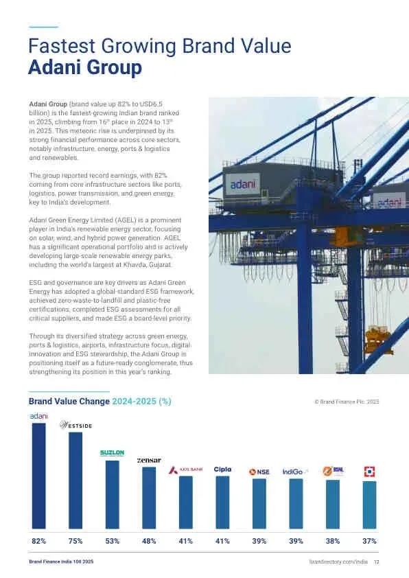 - 新晋力量: Adani集团品牌价值飙升82%至65亿美元,从第16位跃升至第13位,成为增长最快的印度品牌。