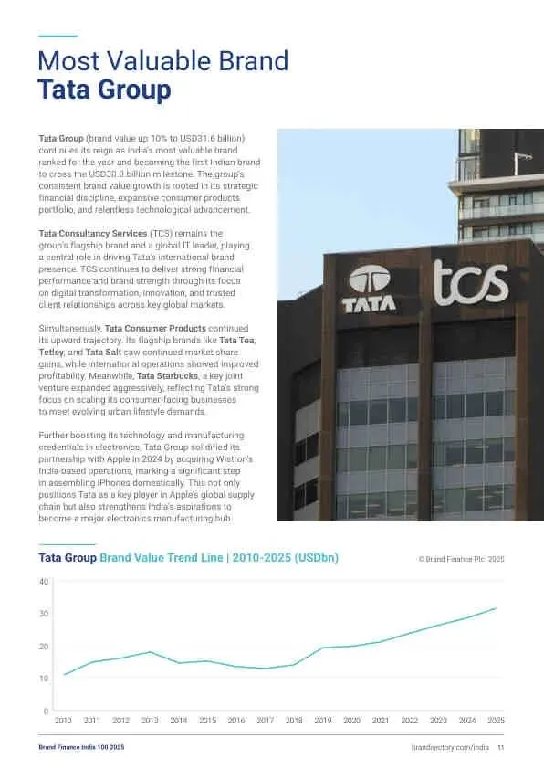 - 冠军: 塔塔集团 (Tata Group) 以316亿美元的品牌价值,成为首个突破300亿美元大关的印度品牌,同比增长10%。