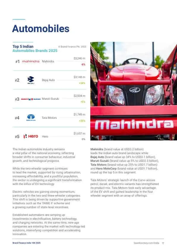 - 汽车行业: 马恒达 (Mahindra) 以32亿美元的品牌价值领跑,Bajaj Auto(31亿美元)增长34%表现抢眼。