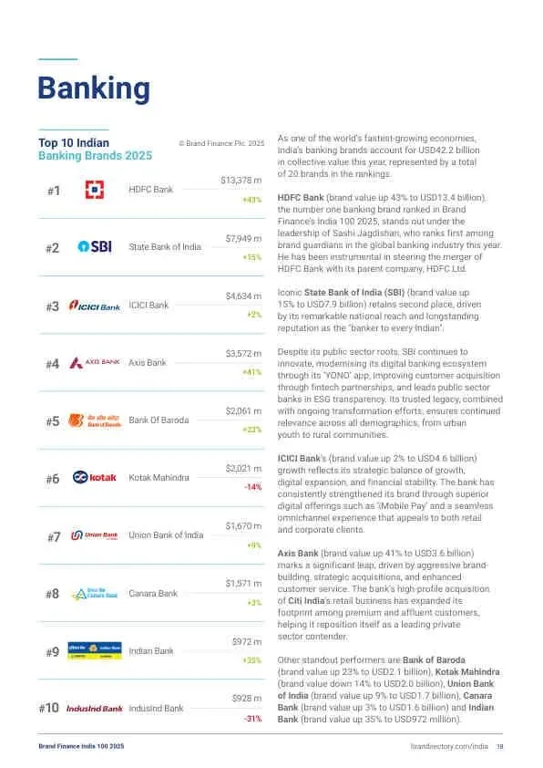 - 银行业: HDFC Bank(134亿美元)以43%的惊人增速位居第一,SBI(79亿美元)稳居第二。