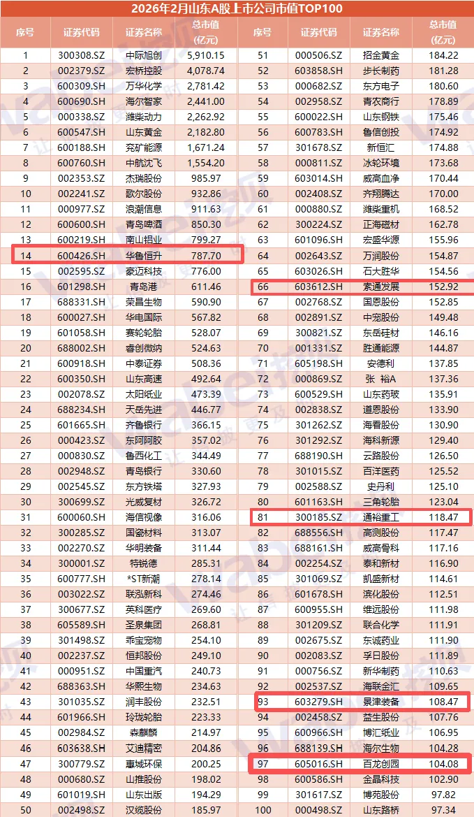 2026年2月山东A股上市公司市值TOP100(数据截至2026年2月11日收盘)