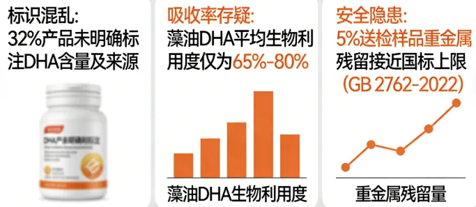 当前DHA市场规模超百亿,但产品良莠不齐。调查显示:标识混乱:32%产品未明确标注DHA含量及来源;吸收率存疑:藻油DHA平均生物利用度仅为65%-80%;安全隐患:5%送检样品重金属残留接近国标上限(GB 2762-2022)。本次测评覆盖国内外56个主流品牌,通过实验室检测、临床数据追溯、跨平台口碑分析(京东/天猫/拼多多超10万条评论),旨在为消费者提供科学选购依据。