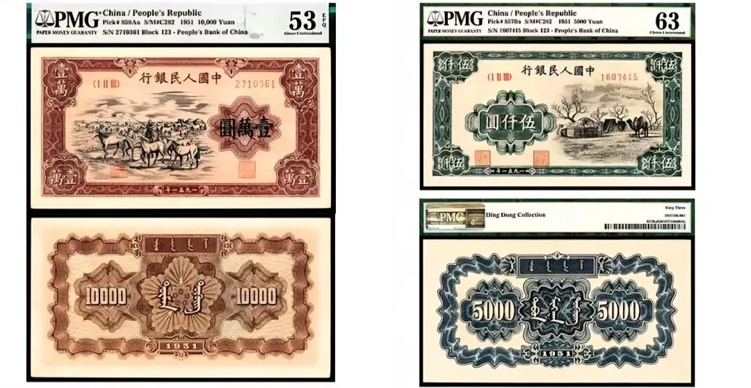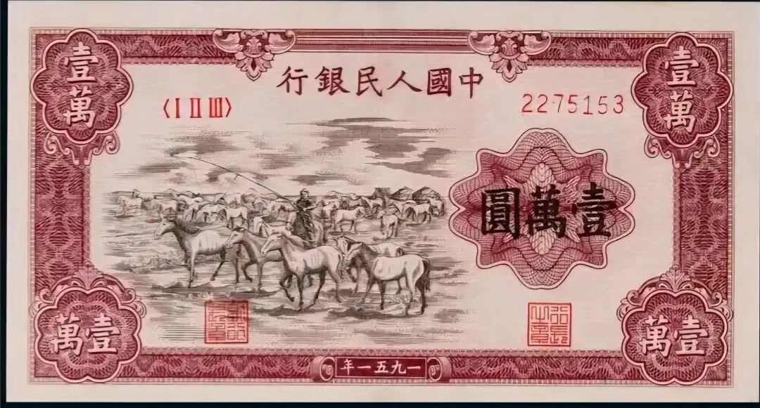 其中1951年发行的1万元“木马图”版,单张价值就超过百万元,是目前当之无愧的榜首。