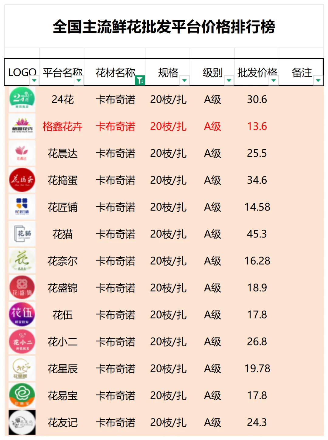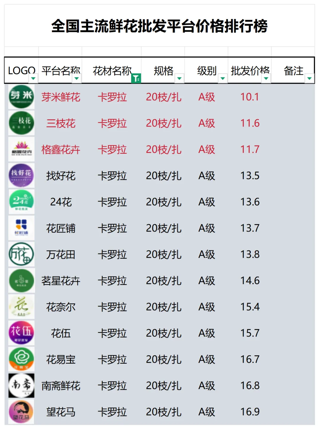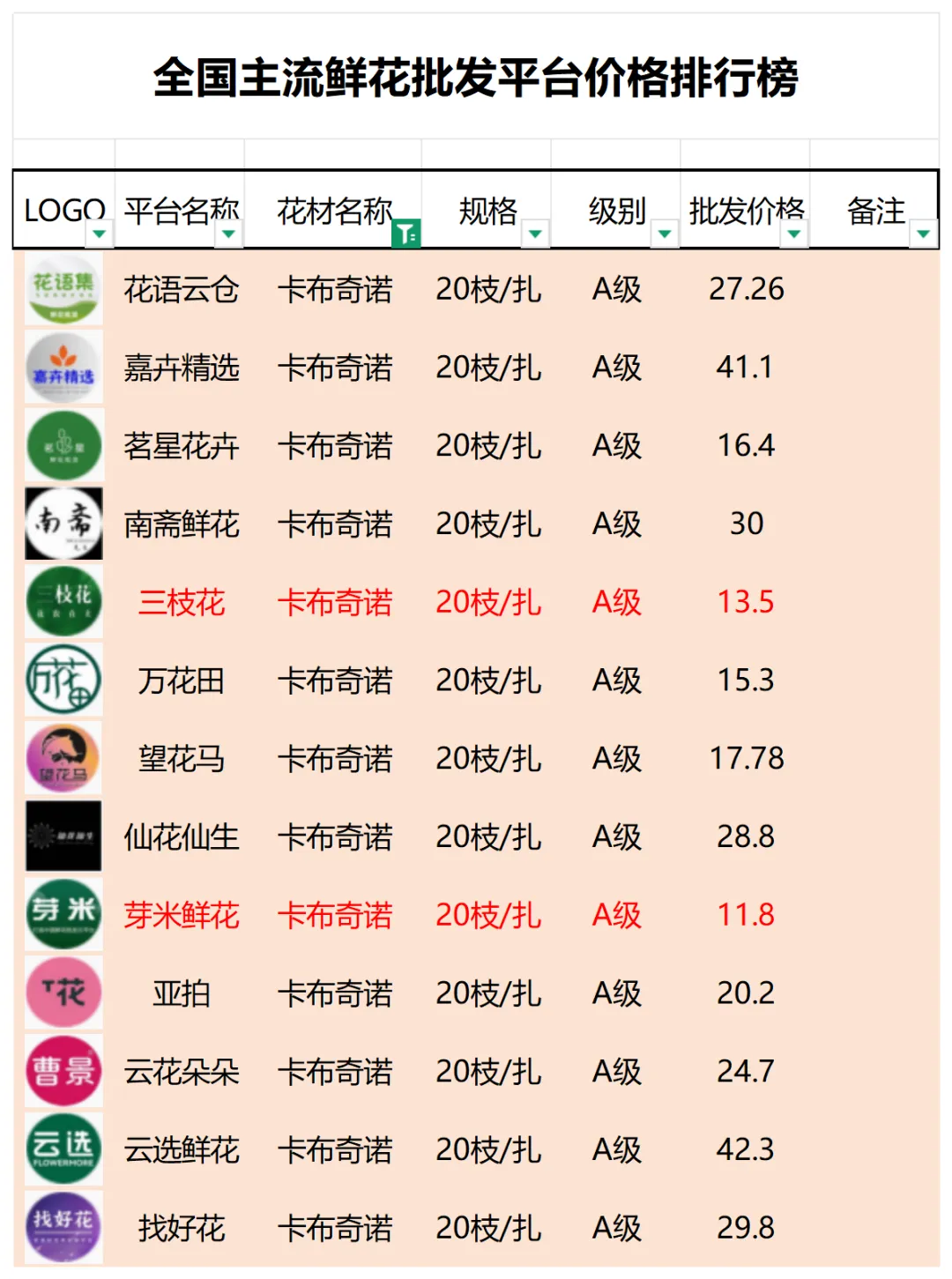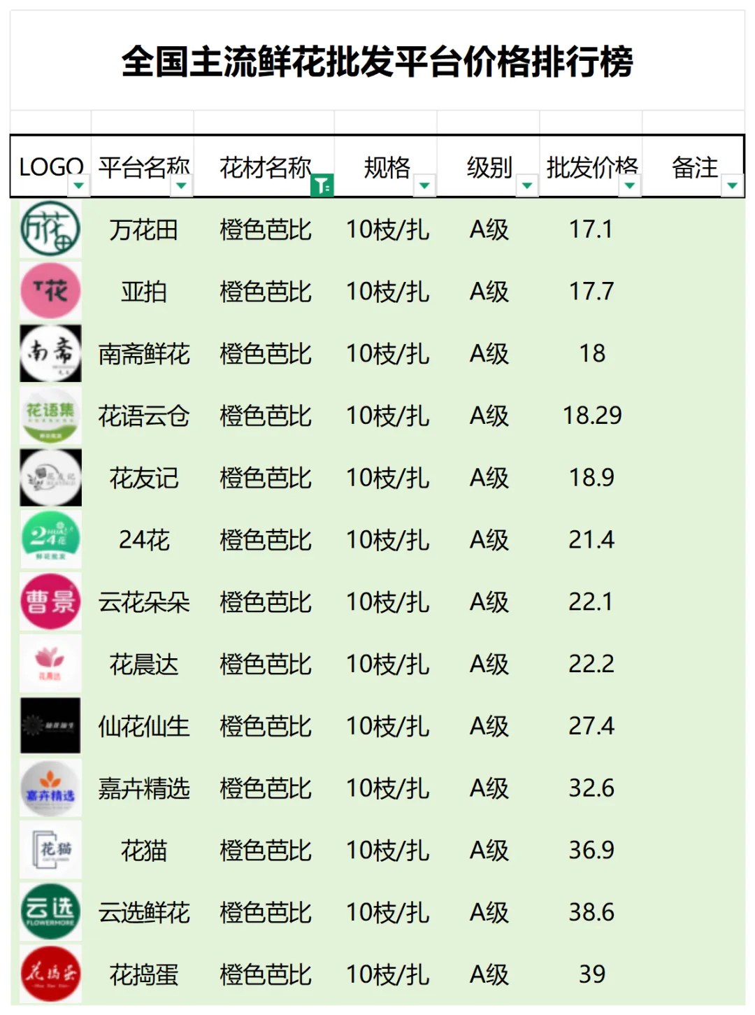 2、本数据只收录A级花材批发价格,覆盖全国大部分主流鲜花批发平台