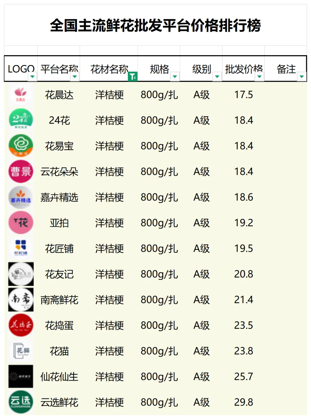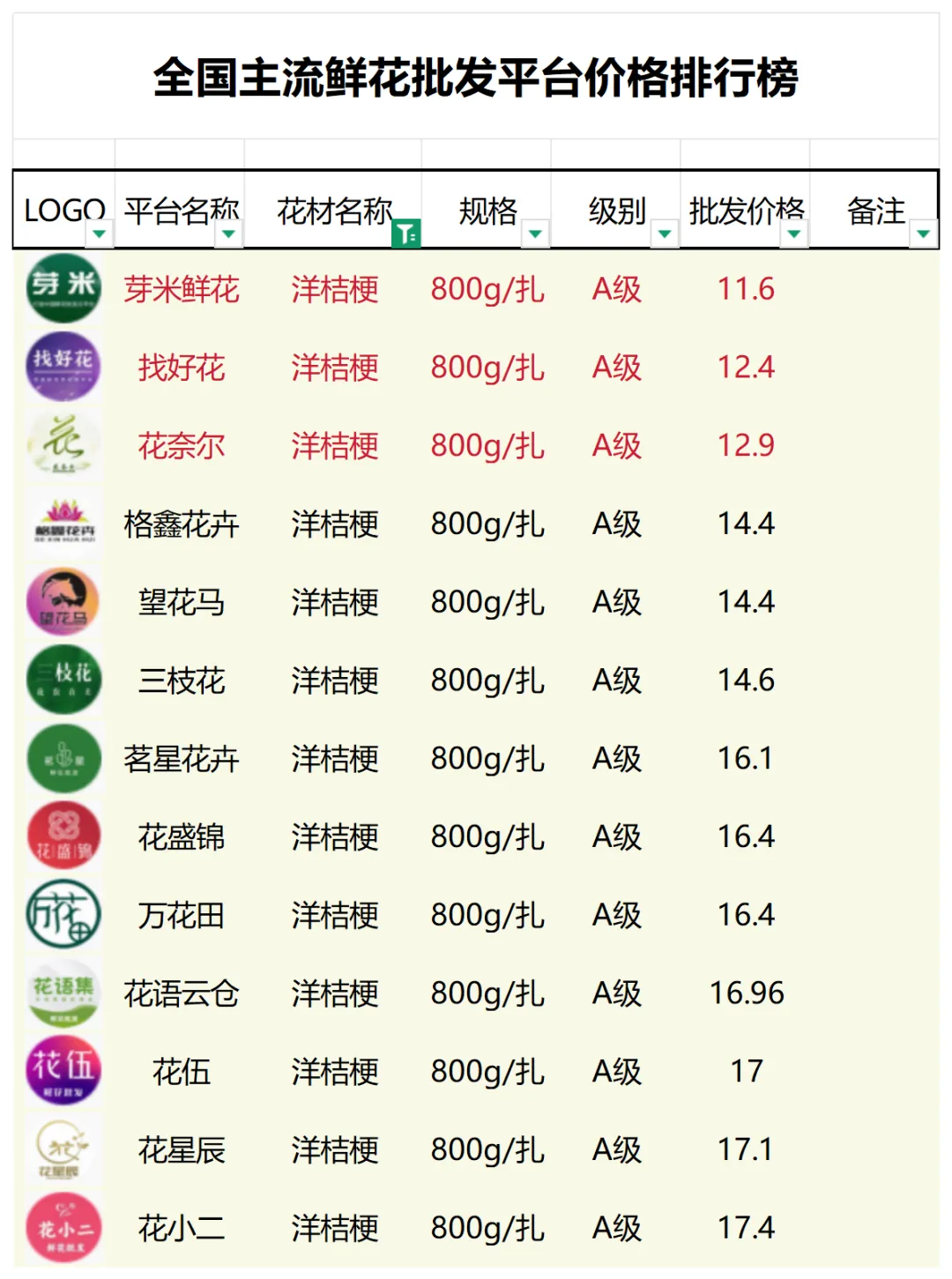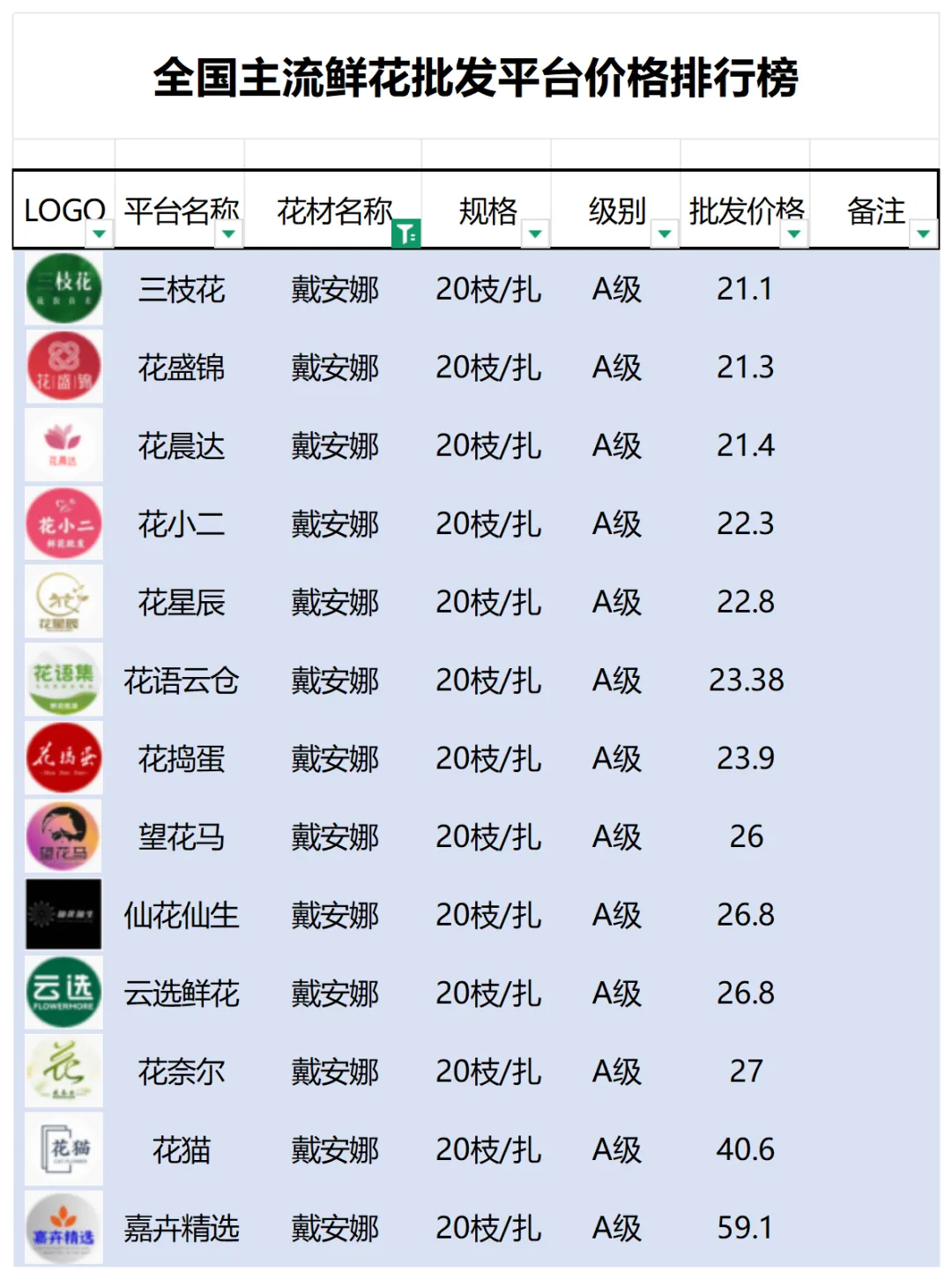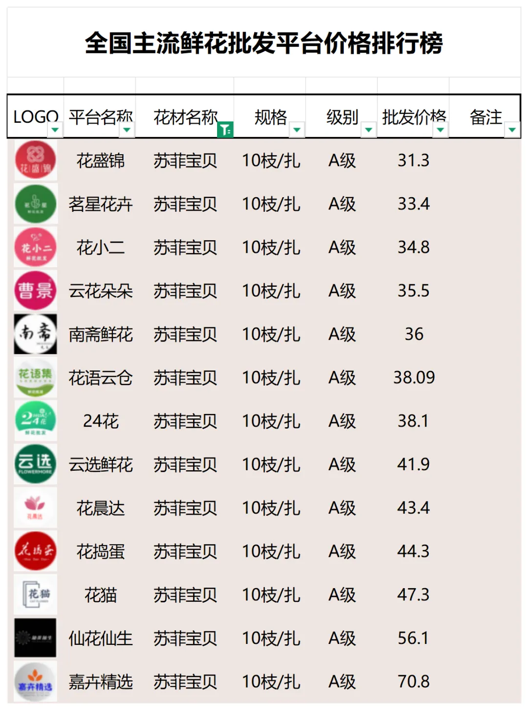 2、本数据只收录A级花材批发价格,覆盖全国大部分主流鲜花批发平台