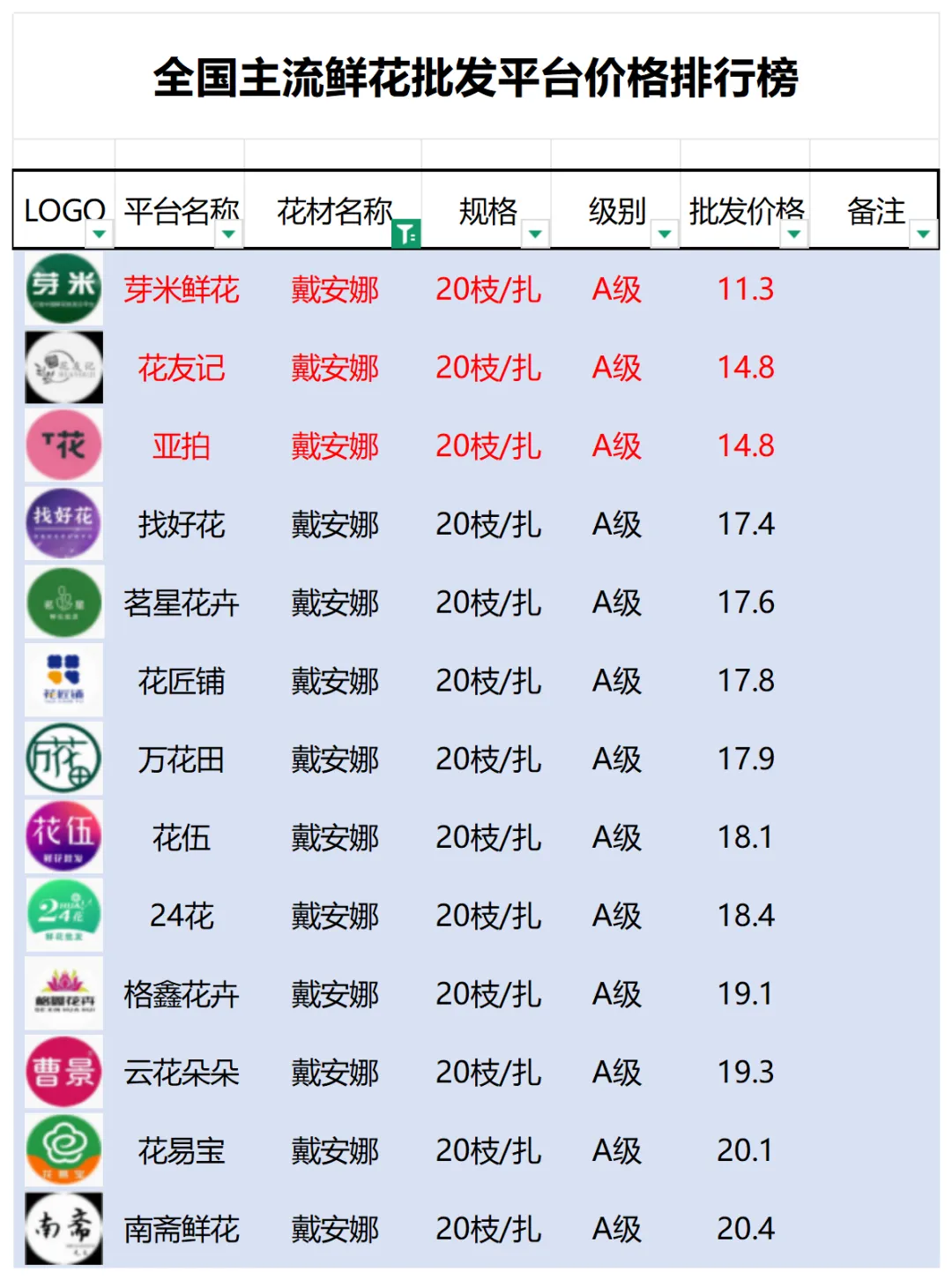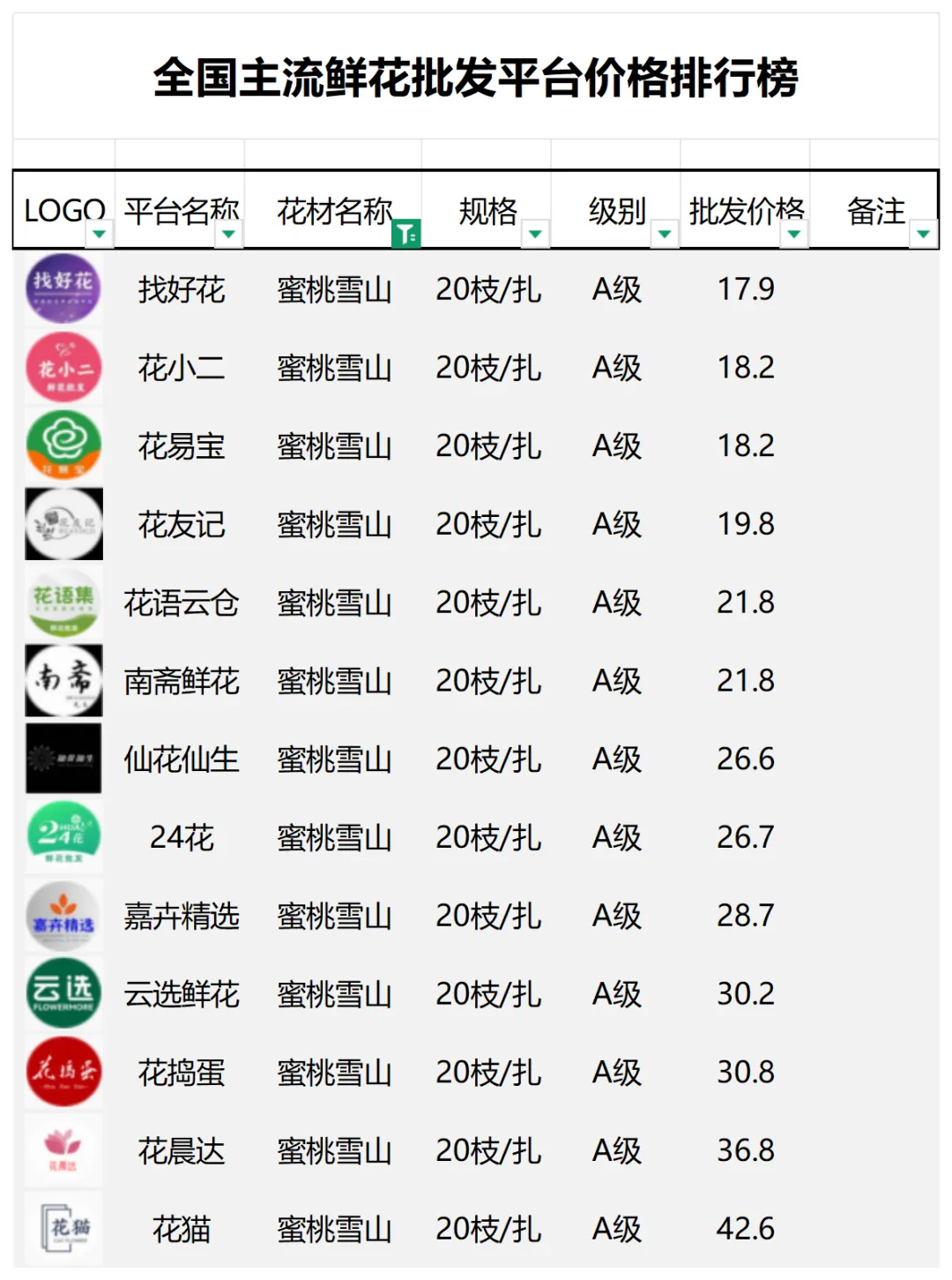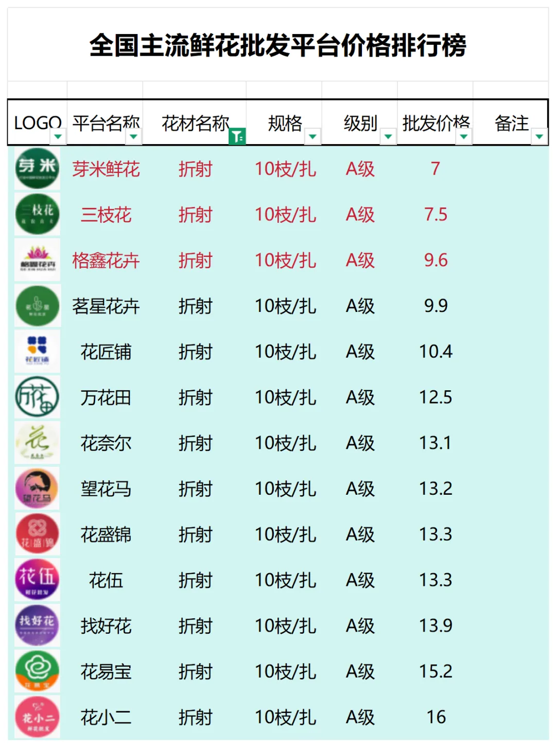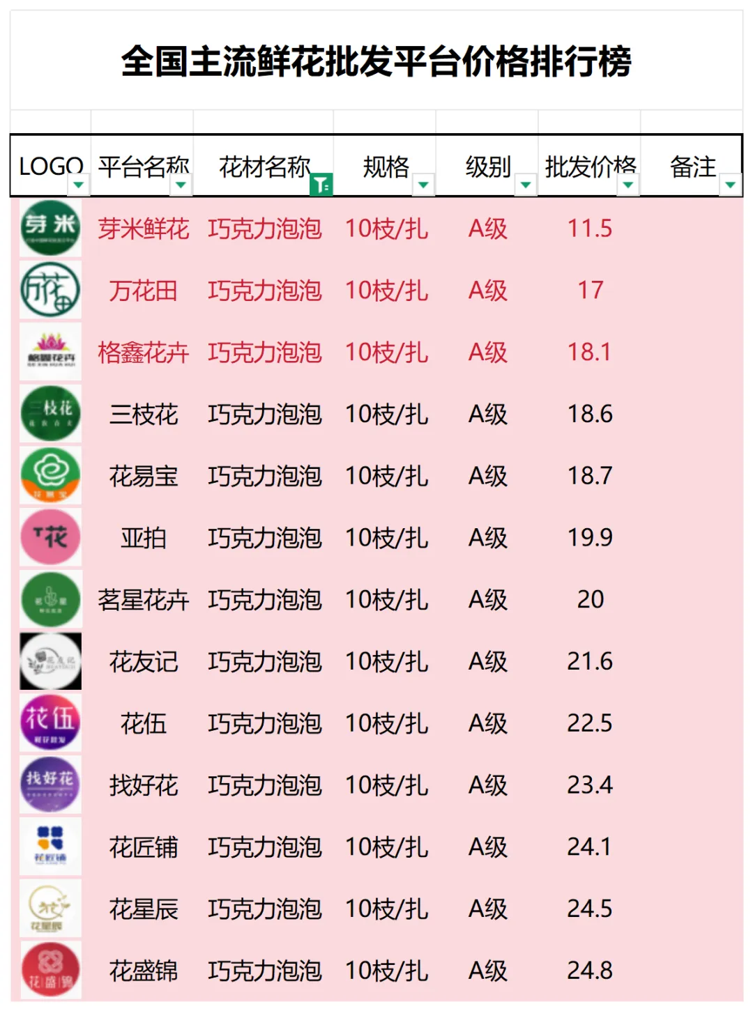 2、本数据只收录A级花材批发价格,覆盖全国大部分主流鲜花批发平台