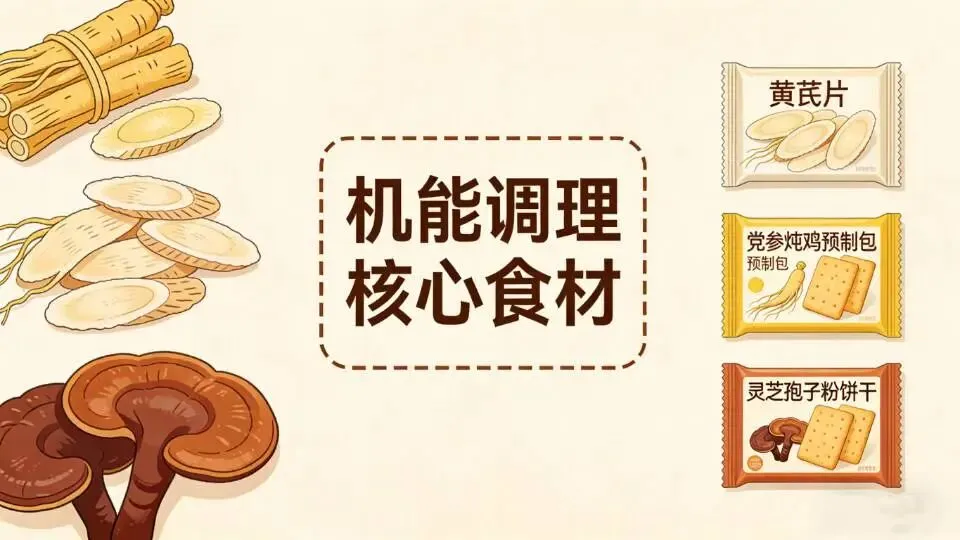 与传统滋补品不同,如今的机能调理类药膳更注重“轻滋补”与“日常化”。例如,黄芪片泡水、党参炖鸡预制包、灵芝孢子粉饼干等产品,既保留了传统药材的调理价值,又通过工艺创新降低了食用门槛,让消费者可以在日常饮食中轻松实现机能调理。