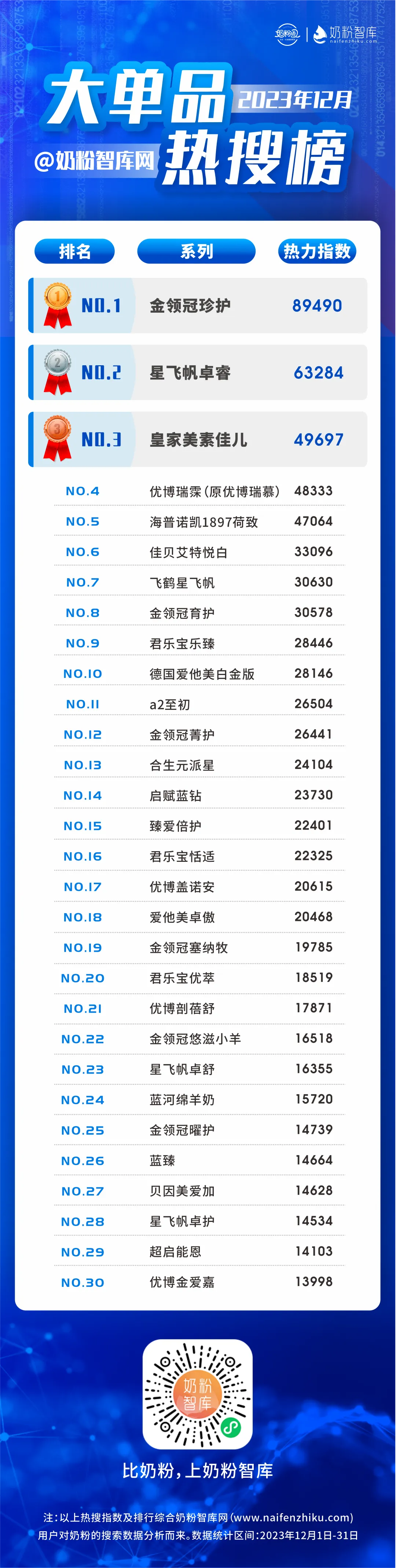 “新国标”时代的到来,标志着行业迎来重大变化,“强者恒强”的发展趋势愈发明显。在品牌集中化的驱使下,“大单品”对消费者的品牌选择产生重要影响,对品牌的重要性不言而喻。基于此,奶粉智库网结合2023年12月用户对奶粉品牌的搜索、点击数据分析重磅发布奶粉大单品热搜榜TOP30,供大家参考。