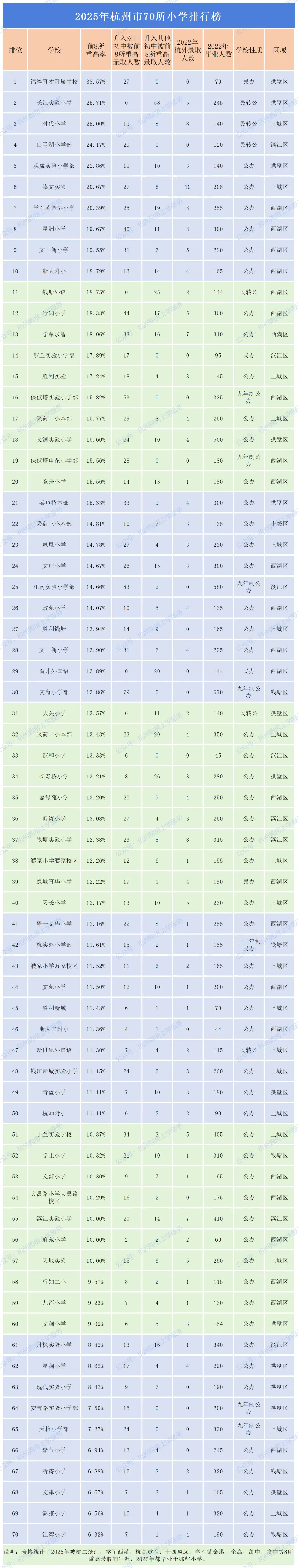 >2025年杭州市70所小学排行榜(前八率)