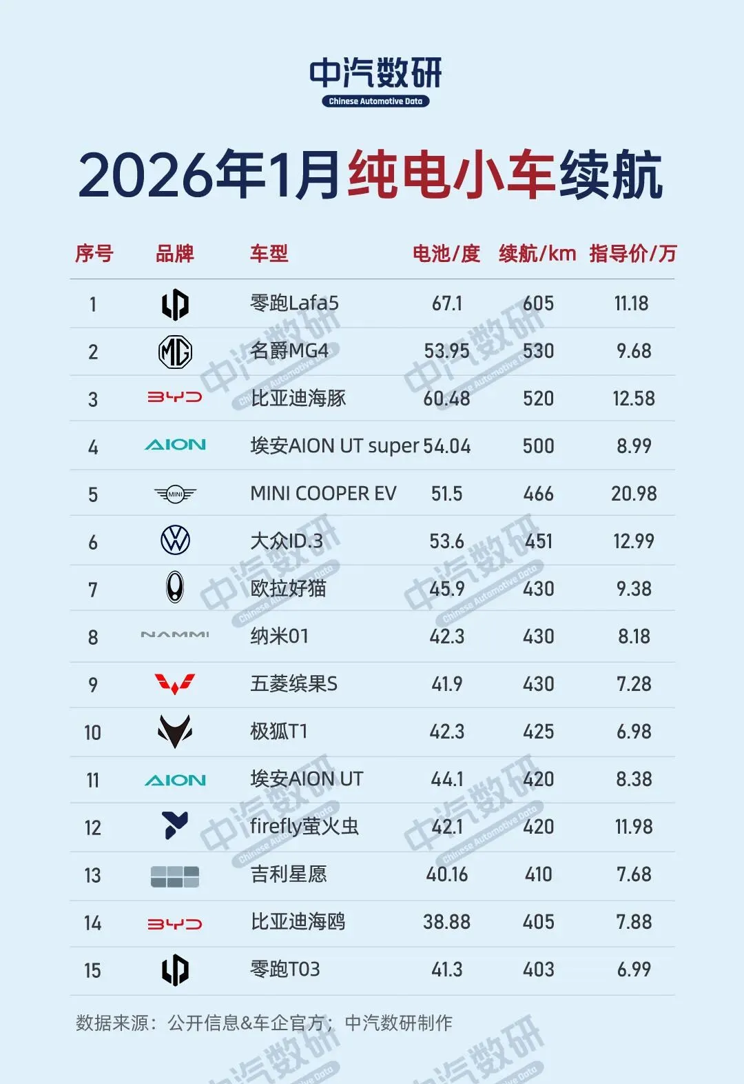 注:每种车型选取续航版本最长的车型,数据更新至2026年1月