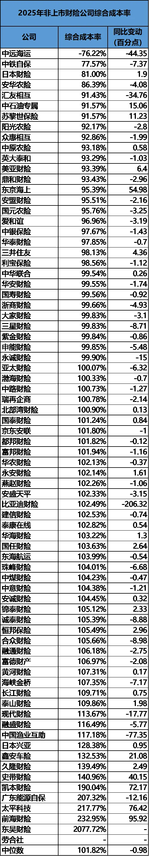尽管利润数字光鲜,但财险公司的两条腿——承保与投资,走得并不稳健。与寿险公司利用资本市场牛市大赚一笔不同,财险公司由于资金属性和投资能力的限制,在2025年的投资表现甚至有所下滑。数据显示,多达47家公司的综合投资收益率不及2024年,行业投资收益率中位数也低于去年。这意味着,2025年的利润增长,更多是“勒紧裤腰带”省出来的,而非“钱生钱”赚出来的。尽管行业综合成本率在改善,但2025年仍有45家公司的综合成本率高于100%,处于承保亏损状态。对于这些公司来说,卖保险本身是亏钱的,它们需要依靠投资收益来填补窟窿。行业综合成本率的中位数为101.82%,远高于全行业98.6%的平均水平,足以说明中小险企在承保端的压力之大。