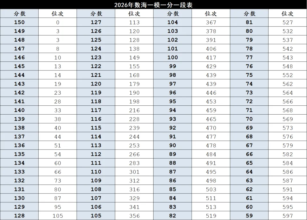 部分数据如下:2026年数海一模线上联考共七百余人交卷,其中有效试卷达597份。平均分为108.00分,中位数为110分,大致成绩分布如下,一分一段表如下。