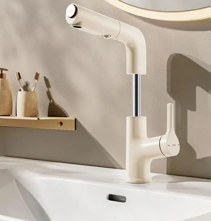 九牧的畅销型号双功能抽拉式系列水龙头,采用双功能抽拉设计,出水管支持360°旋转+抽拉延伸(抽拉长度约60cm),轻松覆盖传统水龙头够不到的面盆角落、台盆边缘。洗头、洁面时可将出水管拉至面前,避免弯腰低头凑水流,防止弄湿衣领;清洁台面时直接拉出水龙头冲洗,无需端盆泼水,尤其适合清理牙膏渍、水渍等残留物,让浴室清洁更省力。
