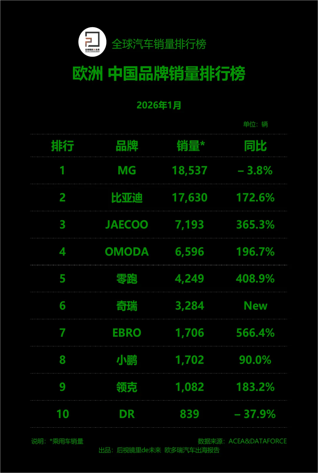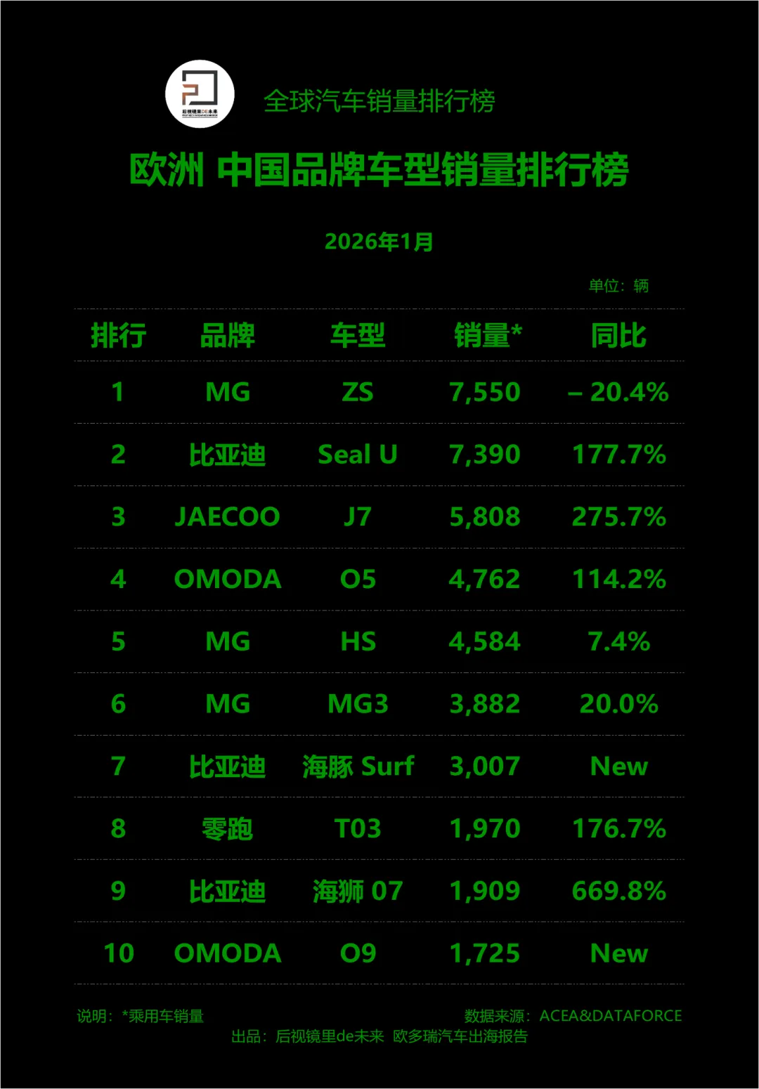 欧洲市场上中国汽车品牌和车型的销量排行榜 | 2026年1月