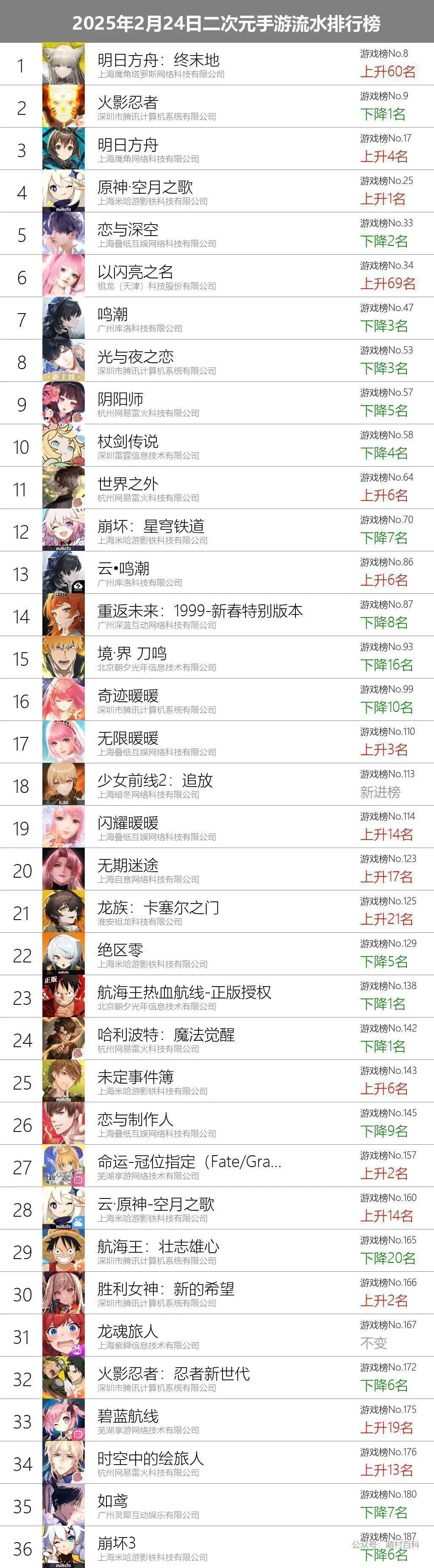 2月24日二次元手游流水排名榜单(文字版)