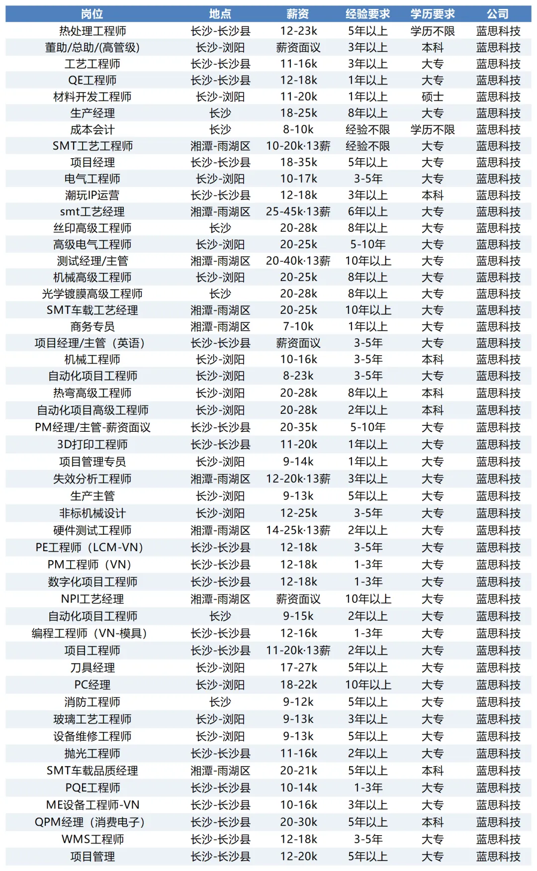 本次招聘岗位以工程技术类为主,地点主要集中在湖南长沙、浏阳、湘潭,少量在深圳、东莞。