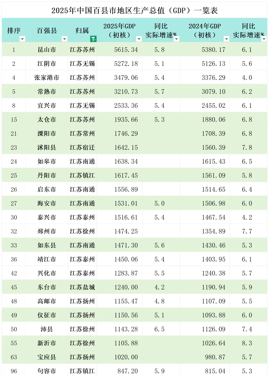 2025年GDP百强县江苏入围24个,昆山第一,启东领先海安