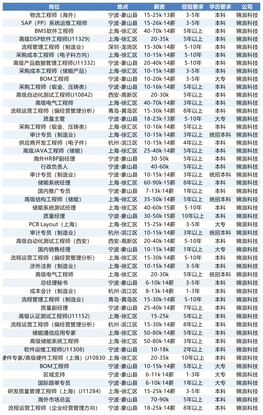 本次招聘岗位以技术研发类为主,地点集中在宁波象山总部、上海徐汇及杭州滨江,少量分布在深圳、西安等地。