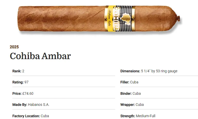 2024年上市的琥珀系列(盒装日期:2025年3月)是古巴最新出品的高希霸雪茄之一,其醇厚质感、均衡层次与绵长余韵令人惊叹。独特的53环径最终被证明是诠释高希霸配方精髓的理想厚度:以橡木与焦糖构筑的大胆内核,包裹着奶油般细腻的精准杏仁香,最终以优雅的果木尾韵收尾。其标志性的猪尾茄帽设计,正是向历史上首款以"高希霸"命名的长矛型号雪茄致敬。