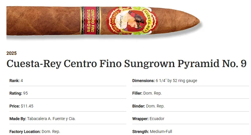 第四名:库斯塔-雷精选阳植9号金字塔(Cuesta-Rey Centro Fino Sungrown Pyramid No. 9)