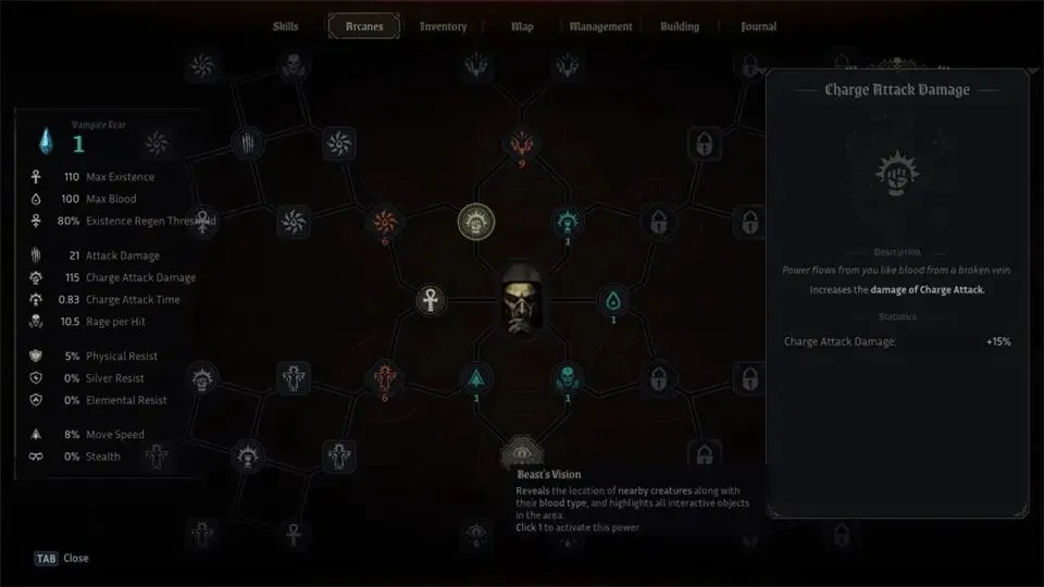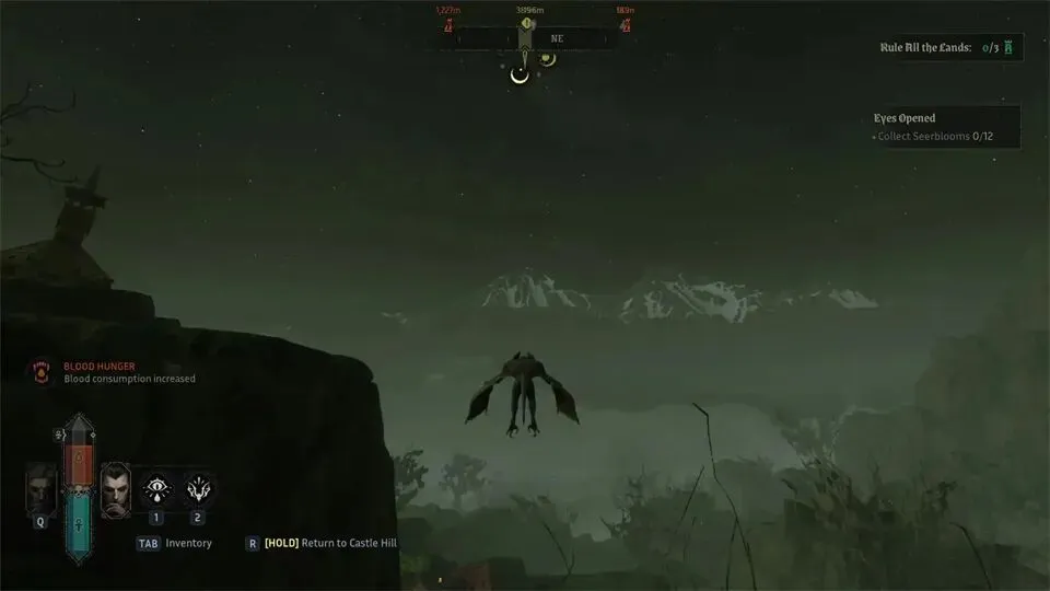 当你血液不足时,这对你帮助很大,因为你不必在附近奔跑寻找动物。你可以简单地使用这个能力,如果周围没有动物,就回到城堡山丘,然后猎杀那些动物。之后你还能解锁其他能力,比如狂怒视野和无拘视力。