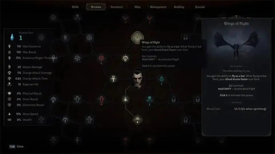 不过你无法立即解锁它,因为它需要九枚吸血鬼之泪,说实话,这花费不少。不过,吸血鬼之泪并不难找,所以我建议先收集并解锁这个能力。夜翼虽然消耗更多血,但非常有用。