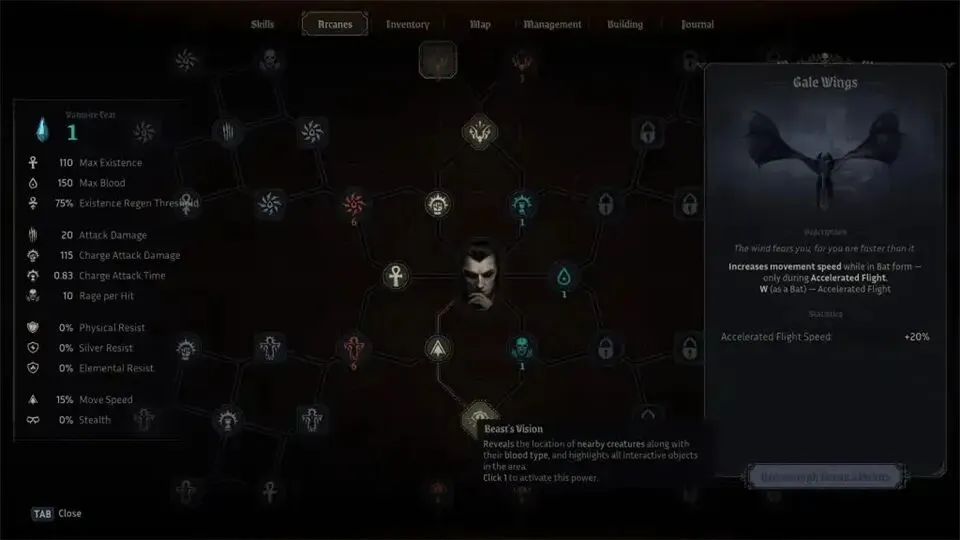 解锁疾风之翼和静音之翼不仅能提升速度,还能降低血液消耗速度。后者还会降低蝙蝠形态下被敌人发现的概率。