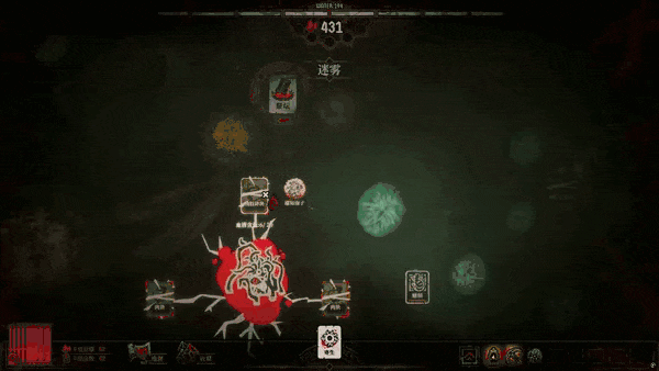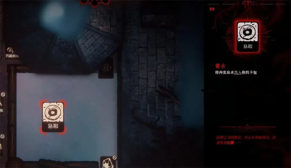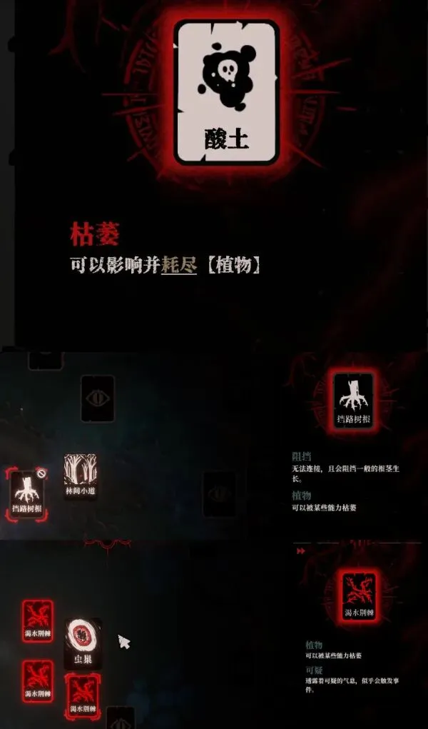 本作的卡牌蔓延需要用到两种基本资源:血液和水分。血液主要通过连接各种生物来获得,可获得的总量相对充足,而水分获取的方式非常少,仅有泉眼一种能直接产出水分的设施,特别是在第三章和第四章的雪天会大大增加用水量,因此在探索过程中一定要节约用水,有时候宁可多放一张卡牌也要减少用水。