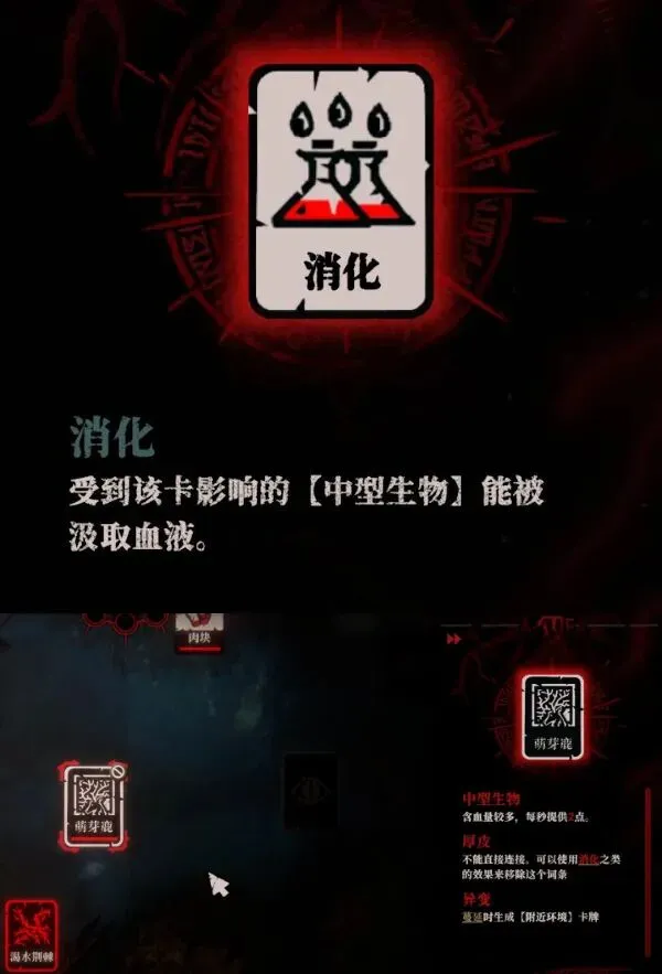 部分生物右上角会有一个 符号,这类生物带有厚皮属性,无法直接连接,需要使用消化卡牌去除厚皮才能连接,大部分都是中型生物,但注意有些植物的右上角也有 符号,使用前务必看清楚了。