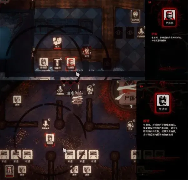 两种桶的作用效果都是一个圆形范围,只要范围内有卡牌被连接就会触发对应的效果。粘液桶会移除范围内卡牌的厚皮效果(相当于用了一次消化),并且给卡牌添加粘稠效果(实测应该是增加水分消耗)。酸液桶会给范围内的卡牌增加助长效果(减少血液消耗),特定条件下还有引燃效果。
