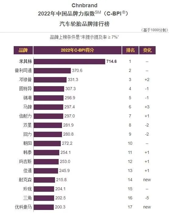 轮胎世界网获悉,国内外17个轮胎品牌,登上该榜单。国内轮胎品牌,包括双星、回力、朝阳、玛吉斯、玲珑、三角等。耐克森和优科豪马,是2022年首次入选此榜单的轮胎品牌。据了解,中国品牌力指数SM(C-BPI),是国内具公信力的品牌榜单之一。自2011年首次推出后,其连续数年获得工信部品牌政策专项资金的支持。它的研究结果和对品牌的价值解读,都具备极高的权威性和影响力。此次活动,由中国领先的品牌评级与品牌顾问机构Chnbrand组织开展。(本文由轮胎世界网整理,转载请注明来源:轮胎世界网)