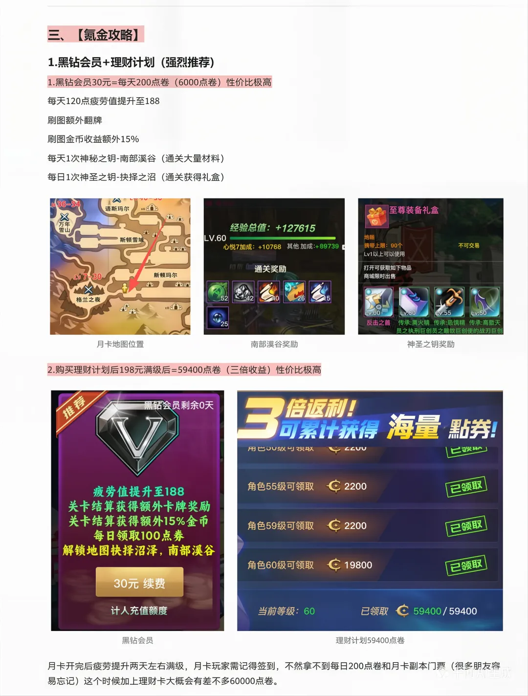 月卡 :南部溪谷是主要的材料产出,时间多可以多建几个小号理财卡:大佬建议合天空,城镇移速飞快,微氪建议商城买时装礼包比普通时装属性略高点卷:大佬开织星魔盒,可开出毕业光环,称号 ,皮肤喇叭:世界喇叭发言100次可解锁“噪音发源地”称号,属性面板最高的称号648礼包:里面包含毕业宝珠,蛋糕币,可在赫顿玛尔城镇蛋糕机兑换高级增幅卷