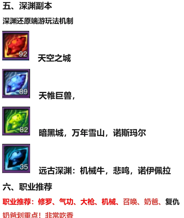 游戏1:1复刻了08年端游剧情首先就是手打升级,满级后优先去刷异界套装,找群里大佬带一下深渊前期先刷天空之城,天帷巨兽的攒灵魂换ss武器和其他玩家一起组队刷冰龙深渊(难度较高)远古深渊门票尽量攒起来,等异界套装凑齐以后去打野猪深渊野猪深渊产出60ss武器,首饰,左右槽,全是毕业的SS装备游戏玩法深度在2~3个月,后续还会更新天界版本,女鬼,20人团本等等