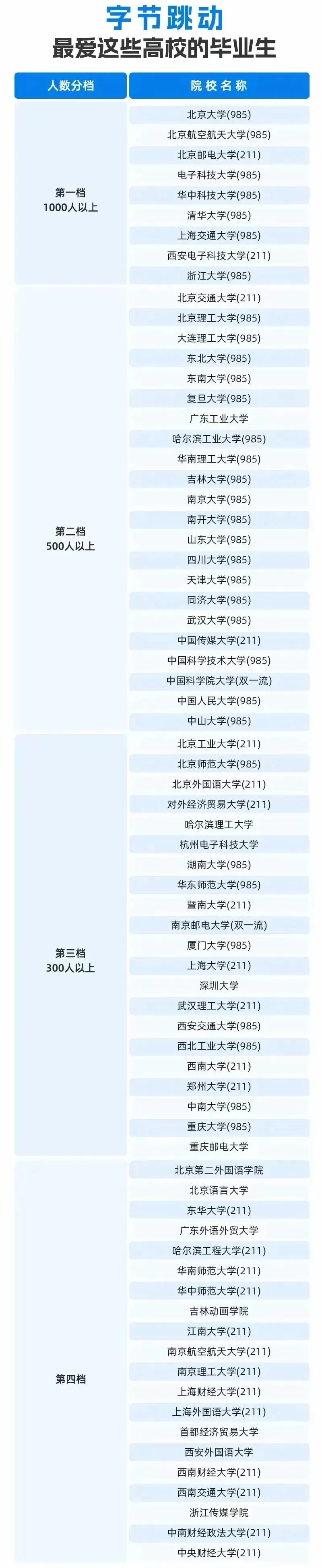这份名单分为四档,第一档以985高校为主,但也有两所211高校格外突出,比如西电和北邮,这两所学校确实在互联网行业认可度极高,我身边不少进大厂的同学都来自这两所院校,所以也不光只是字节偏爱了,可能整个互联网公司偏爱的第一档都有这些学校。