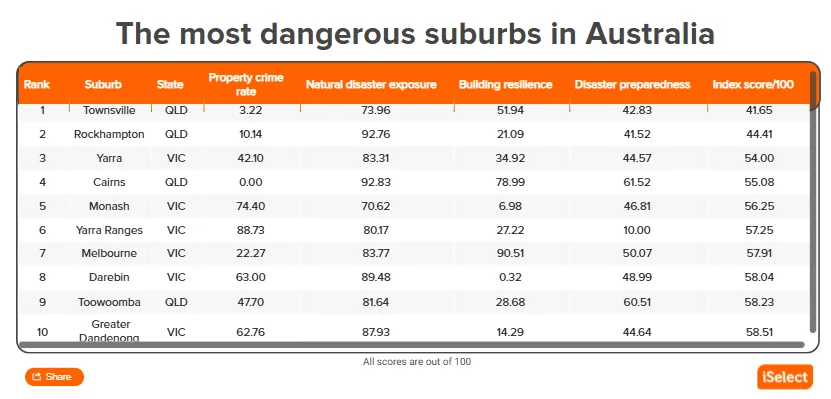昆士兰州在“最不安全区域”榜单中占据了相当大的比例。其中 Townsville 被评为全澳安全指数最低的地区,综合得分只有 41.65。这里的问题并不单一,而是高财产犯罪率叠加中等自然灾害风险、再加上建筑抗损能力偏低。